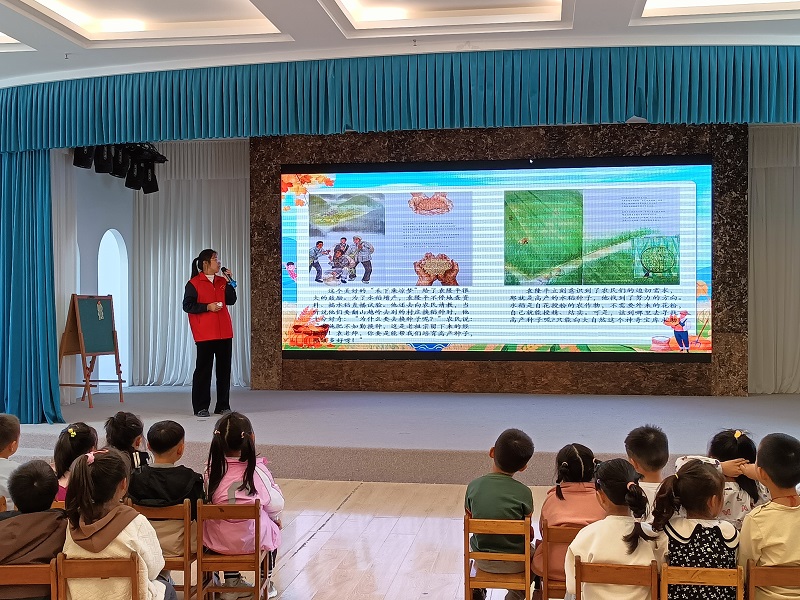 志愿者化身“小老师”,通过PPT生动形象地给孩子们讲述了《一粒种子改变世界》的故事,让孩子们了解“杂交水稻之父”袁隆平的光辉事迹及其生平主要贡献,引导他们树立爱粮惜粮的观念。