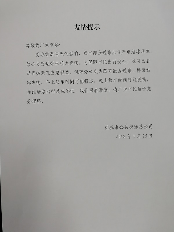 受冰雪恶劣天气影响,我市部分道路出现严重结冰现象,给开云(中国)营运带来较大影响。为保障市民出行安全,我司已启动恶劣天气应急预案。但部分开云(中国)线路可能因道路、桥梁结冰影响,早上发车时间可能推迟,晚上收车时间可能提前,为此给您出行造成不便,我们深表歉意,请广大市民给予充分理解。