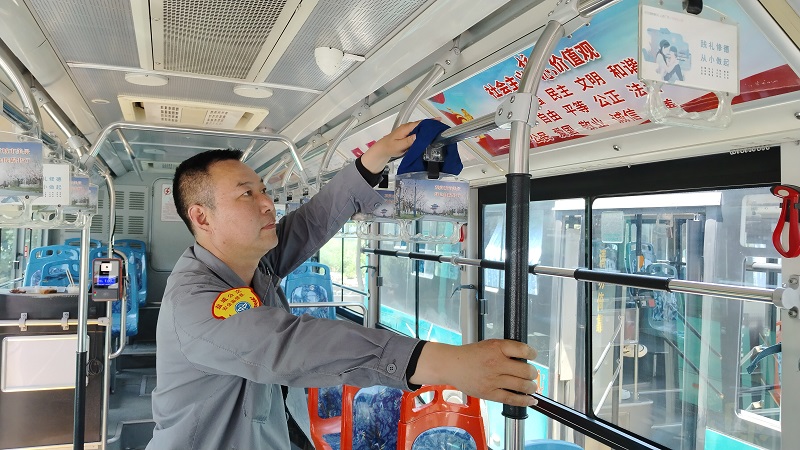 为了更加直观的指导驾乘人员做好车辆清洁工作,分公司邀请车厢卫生较好的13路线路班长丁叶江师傅,录制车辆清洁工作推广视频。视频中,丁师傅从地板到车辆窗户,从座位到扶手,包括空调滤网、吊扇外壳、车轮钢圈等部位,都清理的干干净净,不留一处卫生“死角”。视频录制完成后,通过微信工作群推广,在驾乘人员中起到很好的示范作用。