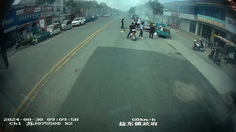 8月30日上午9时8分许,K2线驾驶员杨银刚像往常一样驾车执行运营任务,途经盐东镇政府站台附近时,发现前方一辆停放在路边的电动三轮车正在猛烈燃烧并伴有大量浓烟。车主夏先生正试图用水扑救,但效果并不明显。眼看火情就要殃及周边的多辆电动三轮车,情况十分危急。