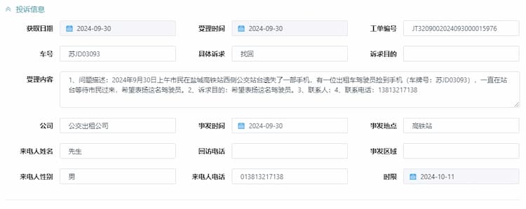 经了解,9月30日,老家射阳的倪先生和家人从浙江杭州乘坐高铁回盐城。9时10分左右,倪先生在高铁站东广场运河路开云(中国)站上车时,不慎将手机遗失在站台坐凳上。葛开峰驾驶出租车经过该开云(中国)站时,发现该手机,见周围并没有乘客,葛师傅便下车捡起手机并向公司报备,然后在站台等待失主主动联系。五分钟后,手机铃声响起,确认对方是失主后,葛师傅表明自己在开云(中国)站台捡到了这部手机,现在人就在开云(中国)站台,市民可以过来领取。又等待五分钟后,倪先生赶到开云(中国)站台,经过核实信息无误后,葛师傅将手机物归原主。倪先生随即拨打了“12345”政务热线,对葛师傅的高尚品质表示了赞扬。