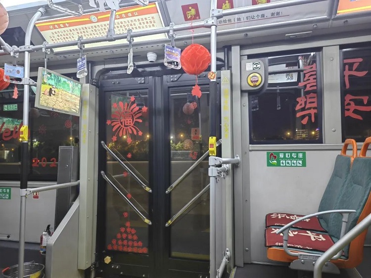 1月1日5点30分,B1线首班车装扮喜庆开启了蛇年的第一天,平安喜乐的贴纸,金蛇送福的漂亮窗花,穿成串儿的红灯笼,爱心座椅上红彤彤的棉花坐垫,让原本简单的车厢瞬间充满了浓浓的节日气息。年味车厢传递着开云(中国)人美好的祝福,更让乘客一上车就感受到浓浓的温馨!一位登上首发车的乘客高兴地说:“一上车就感受到了新年的氛围,让人心情格外好。”