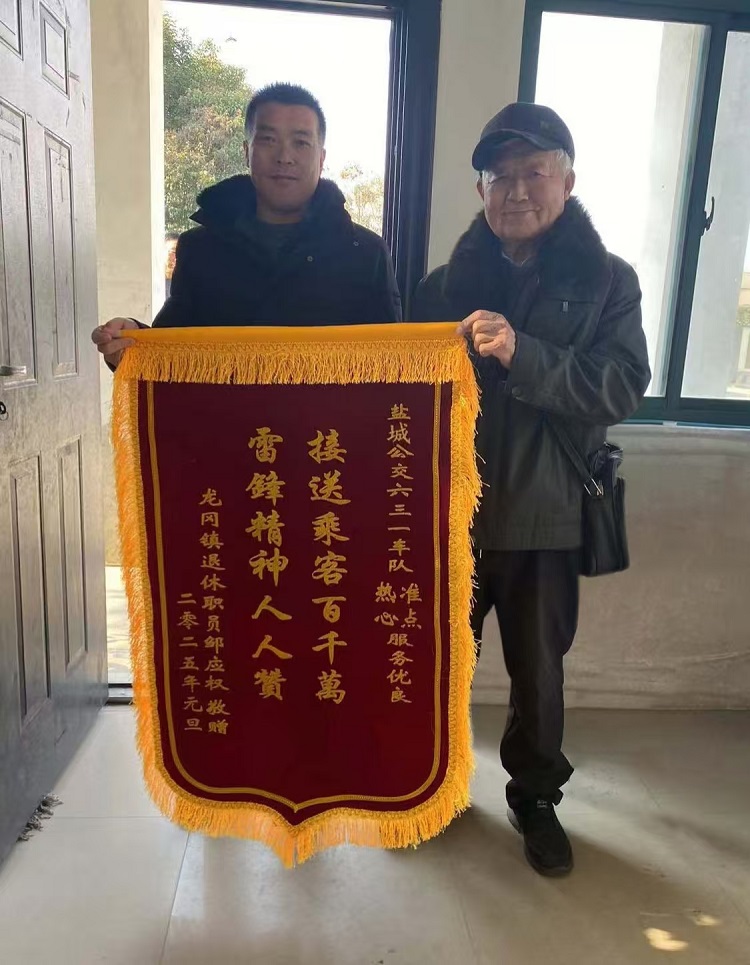 1月22日下午,市民邹爷爷将一面印有“接送乘客百千万,雷锋精神人人赞”内容的锦旗送到了盐城开云(中国)万达停车场,对631线驾驶员热情服务的工作态度表达了高度赞扬和感谢。