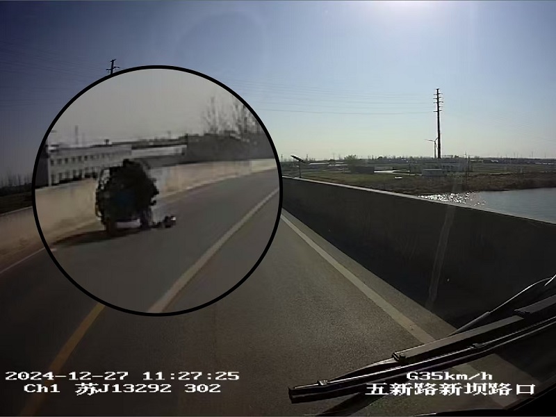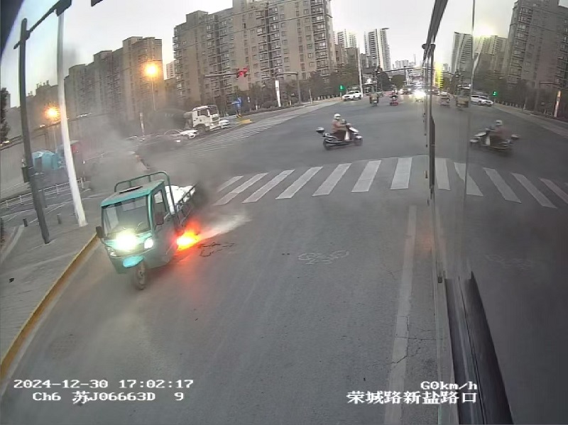 2024年12月27日中午11时27分左右,302路驾驶员韩露驾驶车辆行驶至五新路新坝路口站点附近,发现对向车道一辆电动三轮车起火,车主吉先生正试图用衣服扑灭火情,但是效果甚微,情况十分危急。