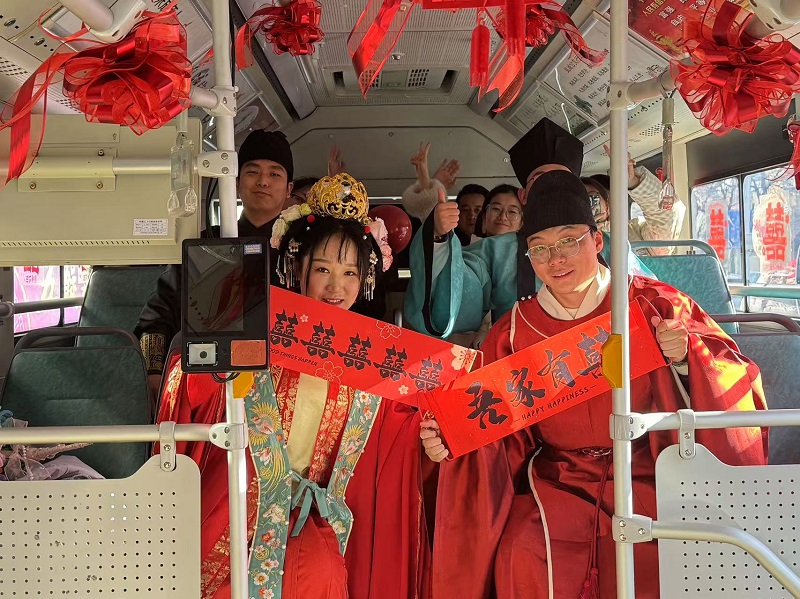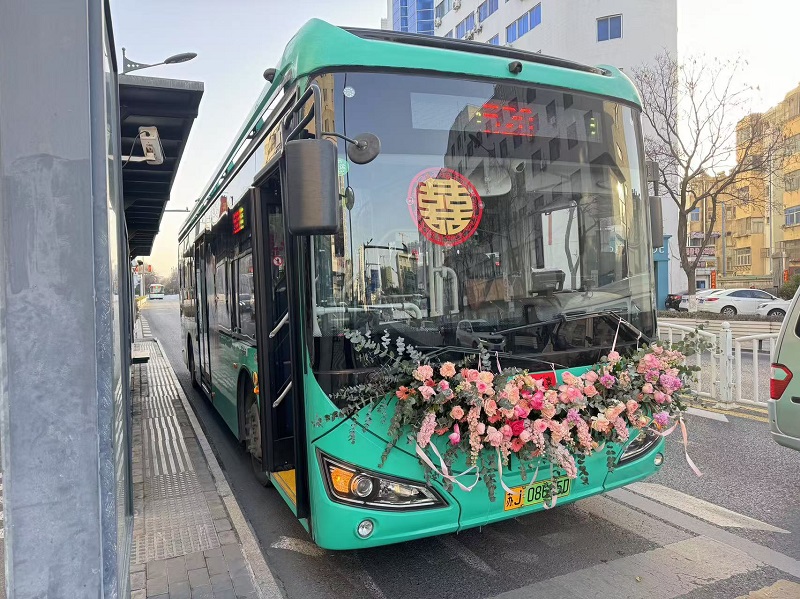2月7日上午,一辆贴着大红“囍”字,装扮着鲜花,由“琴瑟和鸣”开往“永结同心”的520线“开云(中国)婚车”载着帅气的新郎一路生花,迎接美丽的新娘。