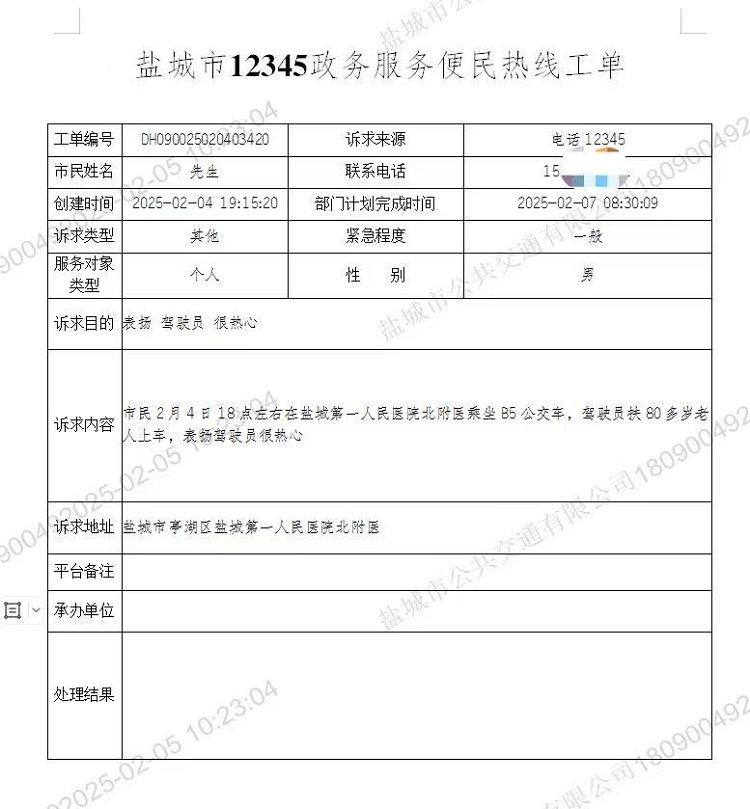 2025年2月4日18点左右,B5线驾驶员童正权在盐城第一人民医院北附医门口,看到一位80多岁的老人准备乘车。童师傅立即下车,主动搀扶老人上车,并为其安排座位。老人的家属事后特意致电12345热线,对童师傅的热心服务表示衷心感谢,称赞他“不仅是一名优秀的驾驶员,更是一位有爱心的盐城人”。