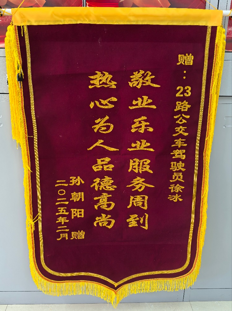 2月6日,孙女士将一面印着“敬业乐业服务周到,热心为人品德高尚”的锦旗送到二分公司,感谢23路驾驶员徐冰热心助人,归还她丢失的手机。