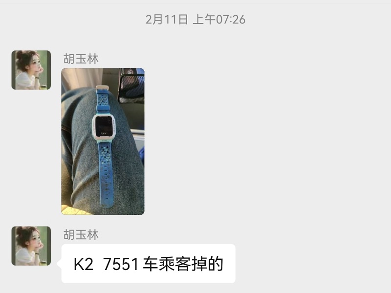 2月11日7时26分许,乘务员胡玉林在协助驾驶员对车辆进行发车前的例行检查时,发现前排座椅夹缝里有一部遗落的儿童电话手表。由于发车时间临近,她便第一时间拍照发至工作群进行失物登记并妥善保管,等待失主来电寻找,然而一直到当天运营任务结束,她都没等到失主的寻物来电。