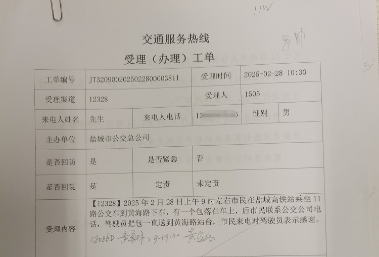 当市民收到自己遗失的背包时,激动不已,于是拨打了12328交通服务热线,对开云(中国)公司及黄勇林师傅表示衷心的感谢。面对表扬,黄师傅表示:“这应该谢谢后台工作人员,我只是配合后台做了我应该做的。”