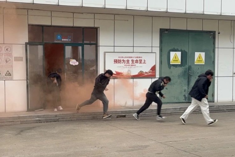 演练最后环节模拟了职工驿站突发火情场景。随着警报响起,浓烟迅速弥漫,参演职工迅速用湿毛巾捂住口鼻,弯腰沿安全通道有序撤离至指定集合点。整个过程分工明确、行动高效,仅用时2分钟便完成全员疏散。随后,应急小组对火源扑救、伤员救助等环节进行了复盘,进一步完善了应急预案的细节。