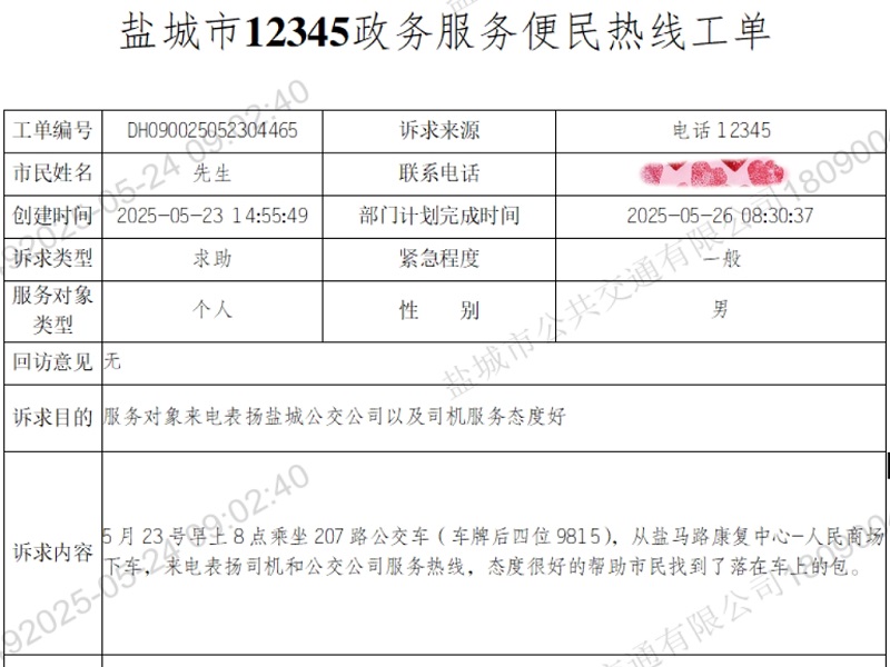 三分公司后台工作人员柏春艳迅速响应,根据陈先生提供的信息,排查当日班次,锁定了他所乘坐的苏J09815D号车,此时驾驶员张超正准备发车。考虑到陈先生上班时间临近,柏春艳提议让张超将手提包带至康复中心站台归还。13时26分许,车辆驶入约定站台,陈先生顺利取回手提包,对张超的拾金不昧和柏春艳的热情服务表示衷心感谢,并拨打“12345”热线进行表扬,于是有了这份特别的“表扬工单”。