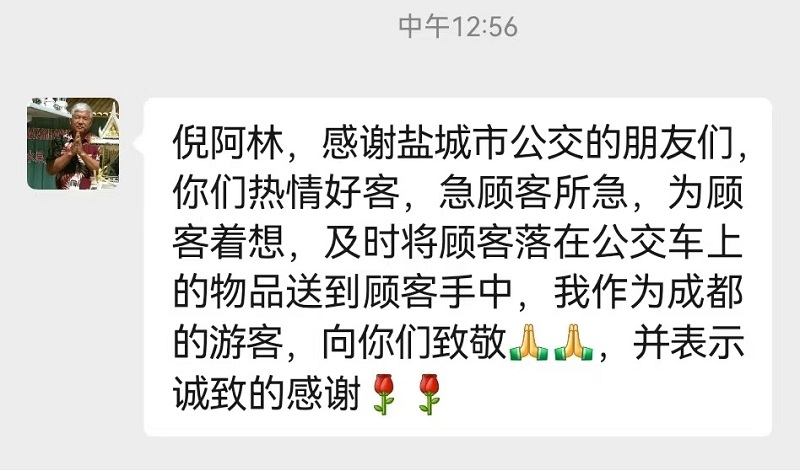 “我不是盐城人,能否麻烦你们司机帮我找个‘跑腿’,将我的背包送到泽一方宾馆……”考虑到谭老先生人生地不熟,为了尽快将背包物归原主,倪阿林果断决定,下班后亲自驾车将背包送至其所住的宾馆。事后,顺利取回背包的谭老先生用真挚的文字深情表达了对倪阿林的感激之情。