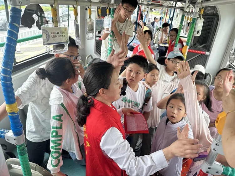 紧随其后的“红色知识乐闯关”环节气氛热烈,工作人员提出的趣味题目围绕党的知识和钱学森生平事迹和科学贡献,引得孩子们踊跃抢答,欢声笑语充满车厢。工作人员准备的精美主题小礼品,更为这次特别的红色之旅增添惊喜。