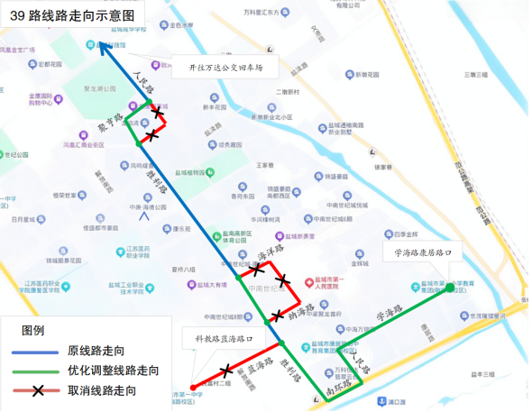 调整后走向:万达开云(中国)回车场、西环路、腾飞路、盐马路、东进路、华夏路、世纪大道、人民路、聚亨路、胜利路、南环路、人民路、学海路、学海路康居路口。