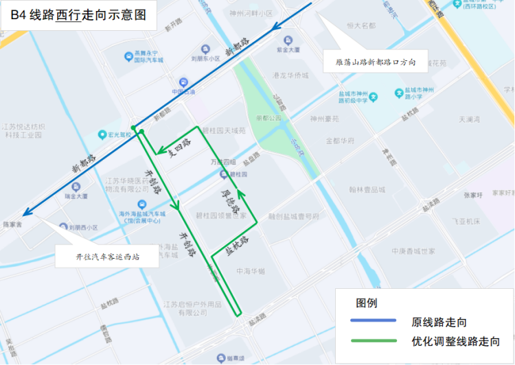 新增停靠站点:华晓医药物流、海外海盐城汽车城、开创路盐渎路口(北)、盐枕路厚德路口、厚德路盐盘路口南、厚德路盐盘路口北、支四路开创路口。