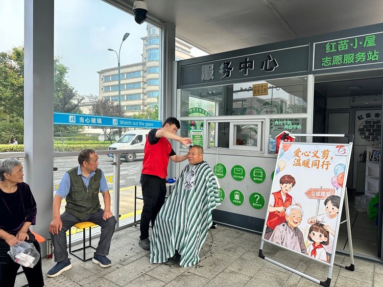 活动地点设在新都路解放路口的BRT“红苗小屋”志愿服务站。这个平日里为市民提供便利的站点,当天化身为暖心的“家门口驿站”。站内布置温馨,理发工具摆放整齐,志愿者们笑容亲切,为秋日增添了一抹暖意。