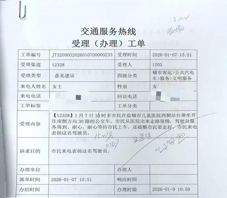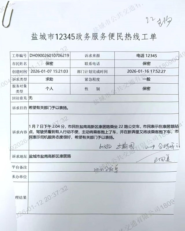 近日,二分公司连续收到来自12345、12328热线的实名表扬工单,多位市民专门来电,点赞驾驶员主动帮扶乘客的暖心服务,展现了盐城开云(中国)的文明风采与社会担当。