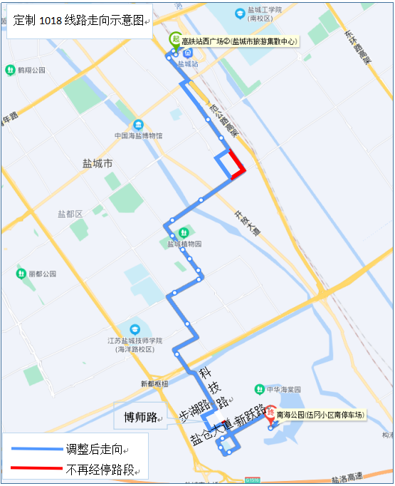 原线路走向:润海路、胜利路、新跃路、科技路、润海路、博师路、新跃路、科技路、盐仓大道、博师路、步湖路、科技路、科教路、学海路、解放路、海洋路、人民路(新龙广场)、盐渎路、文港路、聚亨路、新园路(西伏河创新社区)、世纪大道、范公路、高铁站西广场。