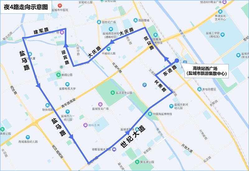 线路走向:高铁站西广场(盐城市旅游集散中心)、东进路、范公路、大庆路、迎宾路、建军路、盐马路、世纪大道、文港路、东进路、高铁站西广场(盐城市旅游集散中心)。