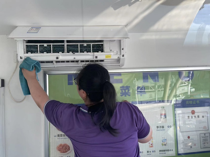 为保证清洗效果,公司聘请了专业保洁人员进行空调清洗作业。保洁人员利用伸缩梯爬上站房顶部,使用清洗剂对空调外壳、冷凝器、风扇、滤网、面板等重点部位进行彻底清洁保养,达到了消毒杀菌、增强制冷、降低电耗的效果,提高设备的使用寿命。