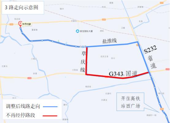 调整后走向:高铁站西广场(盐城市旅游集散中心)、东进路、范公路、建军路、毓龙路、西环路、盐兴路、S232省道、盐淮线、庆丰公路、新村路、东乔村部