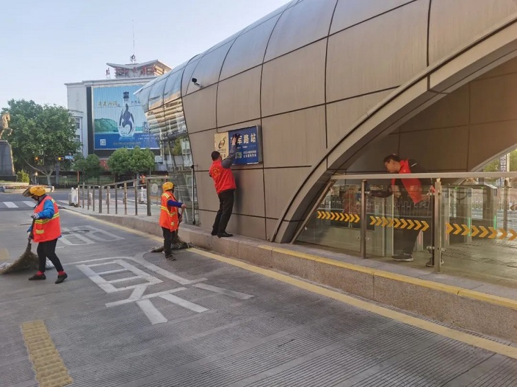 站台外侧墙面、路牌灯箱、安全门,站内智能屏、百叶窗、闸机、垃圾桶、灭火器、座椅、扶手,地面花池杂草等……大家不放过每一个角落,紧盯薄弱环节,不怕脏、不怕累、不埋怨,个个干劲十足,细致认真。