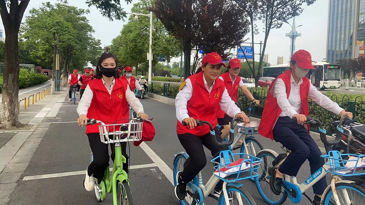 11名党(团)志愿者骑行共享单车沿着绿道向周边餐馆、商铺发“厉行节俭 反对浪费”倡议书。