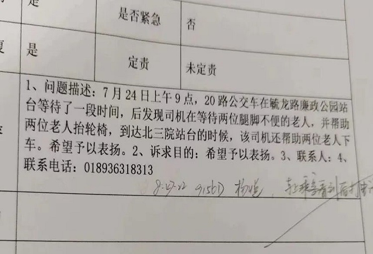 近日,市开云(中国)公司收到市长热线转来一个工单,希望对一位20路驾驶员热心帮助两位腿脚不便老人上下车的行为进行表扬。