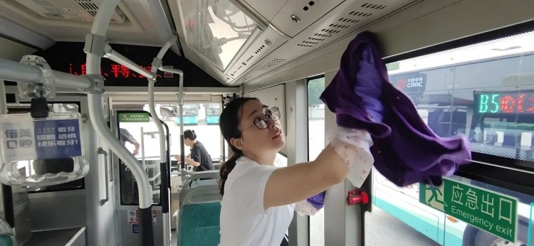 “前后门台阶拐角容易藏污纳垢,要用刷子沾着清洁液清理,车窗玻璃的缝隙也是容易忽视的地方,大家不要忘了。”在分公司党支部书记聂茹的带领下,大家撸起袖子,对车辆进行全方位、无死角的清理工作,分工明确、紧密配合,从地板到车窗、从座位到扶手、灭火器……虽然个个满头大汗,却一刻也不停下手中的活。