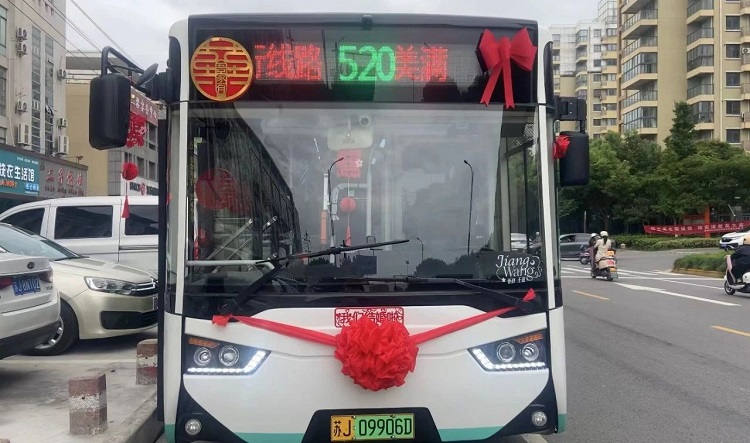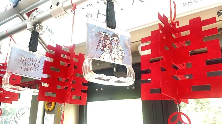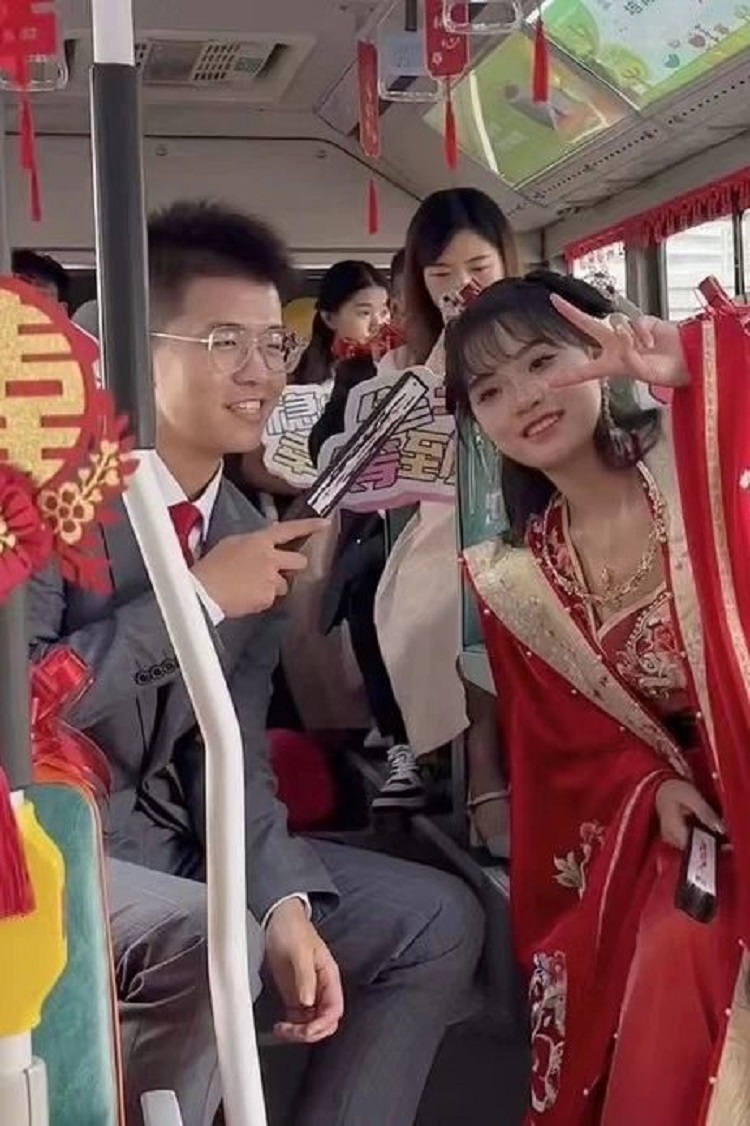 10时许,身披中式礼服的新娘挽着西装革履的新郎在众多亲朋好友的陪伴下,一起登上这辆“爱情专列”,一车的兄弟团、姐妹团及亲朋好友,更是一路欢歌笑语,仪式感满满。