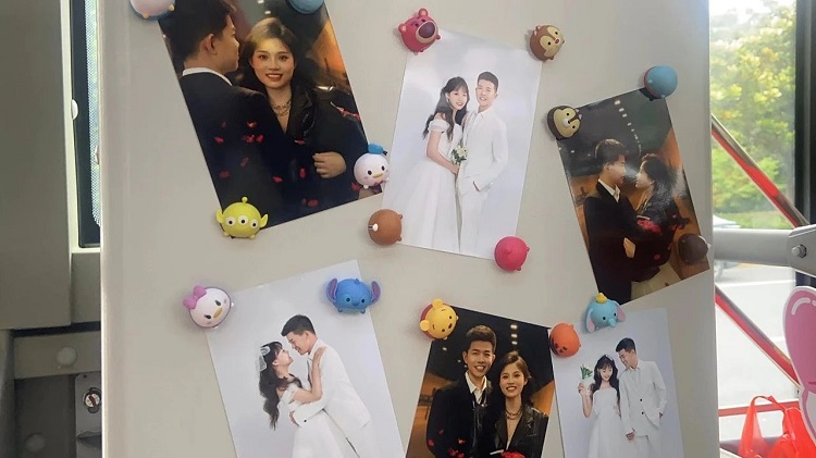 大大的红花、吉祥的囍字、鲜艳的气球,浪漫的婚纱照……一对新人亲手布置的“爱情专列”里外都透着浓浓的甜蜜气息。